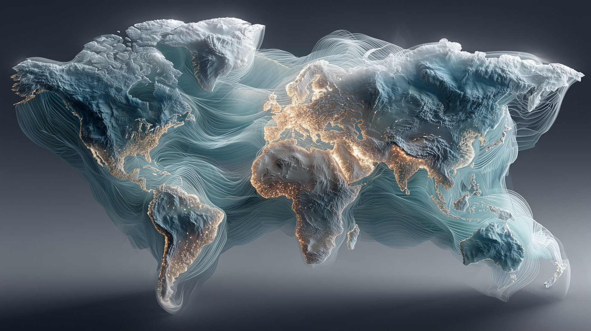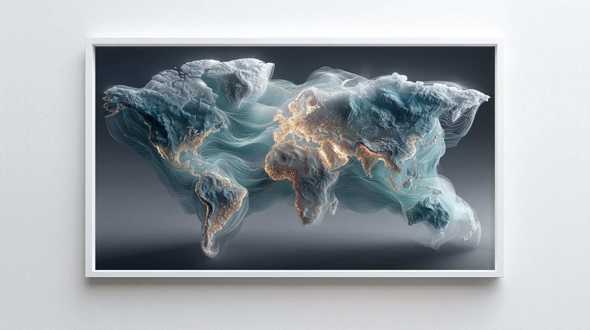 Contemporaine et hypnotique, Nébule illustre les interconnexions du monde à travers un maillage de filaments lumineux et de reliefs contrastés. Les continents semblent flotter dans la nuit, baignés par les lumières humaines et les ombres naturelles.