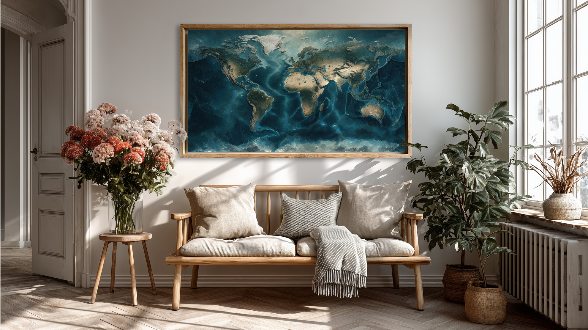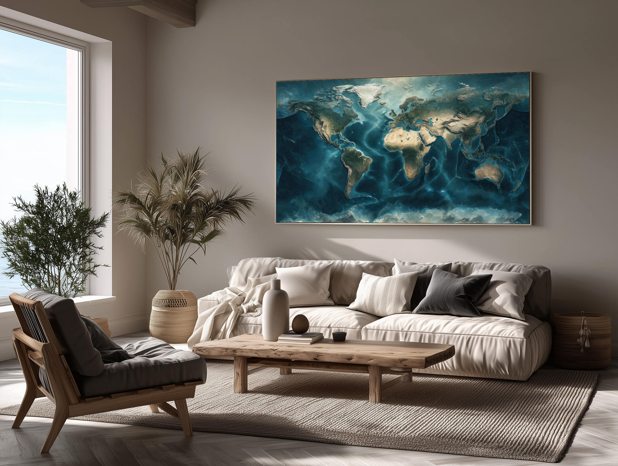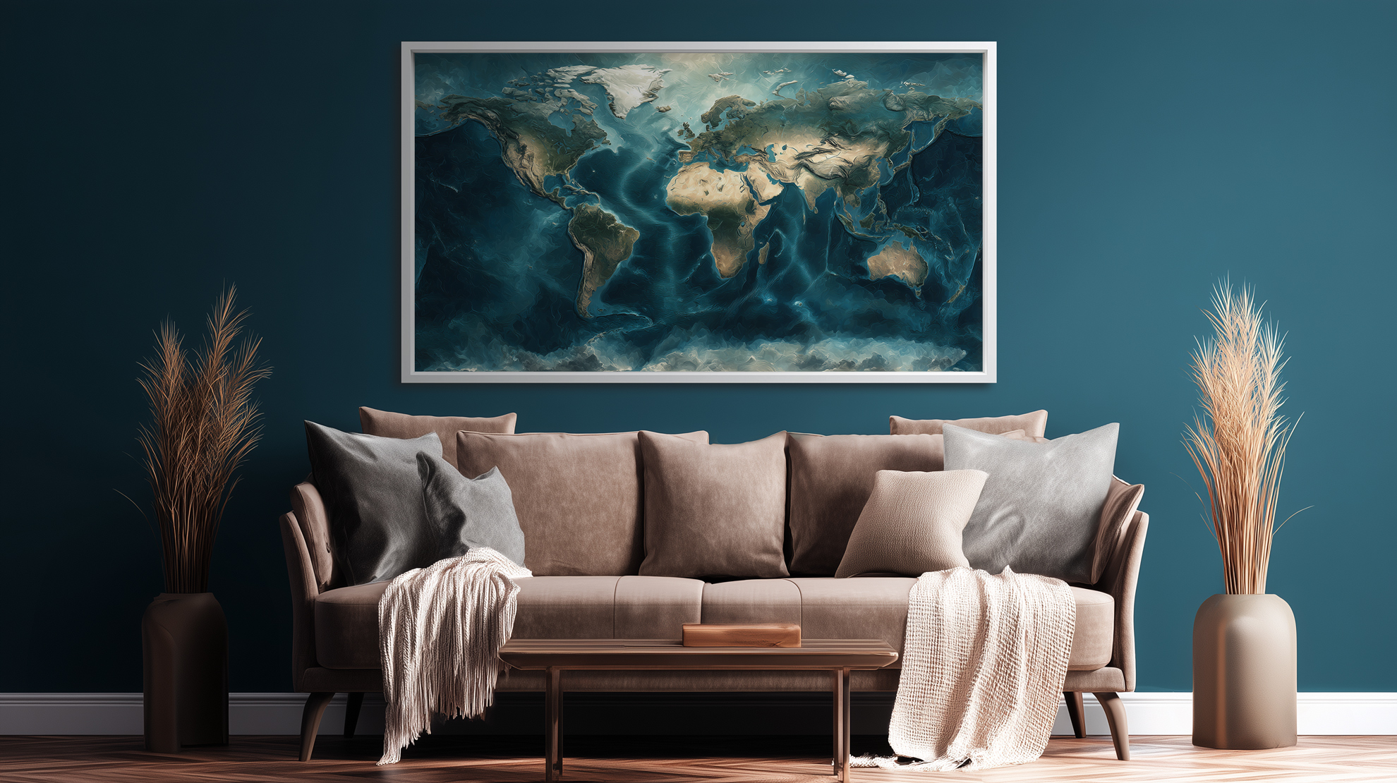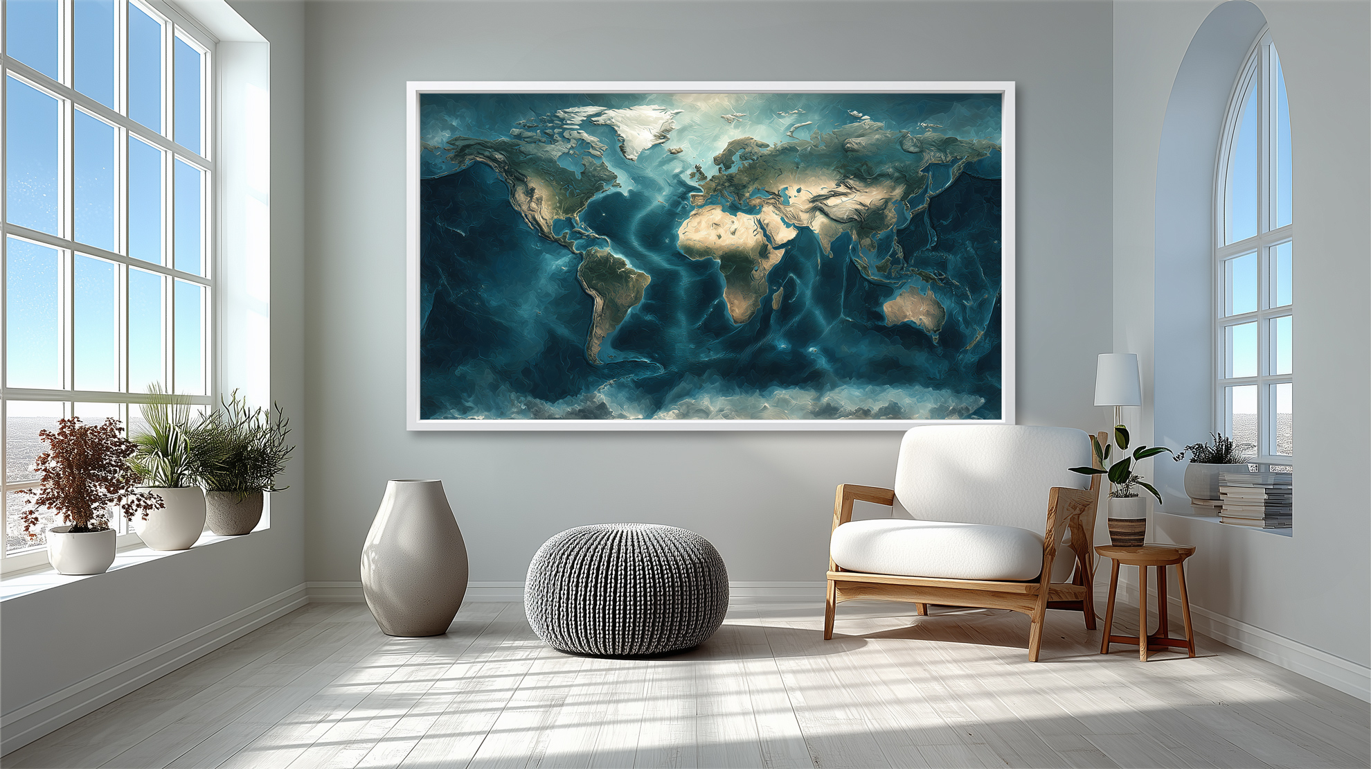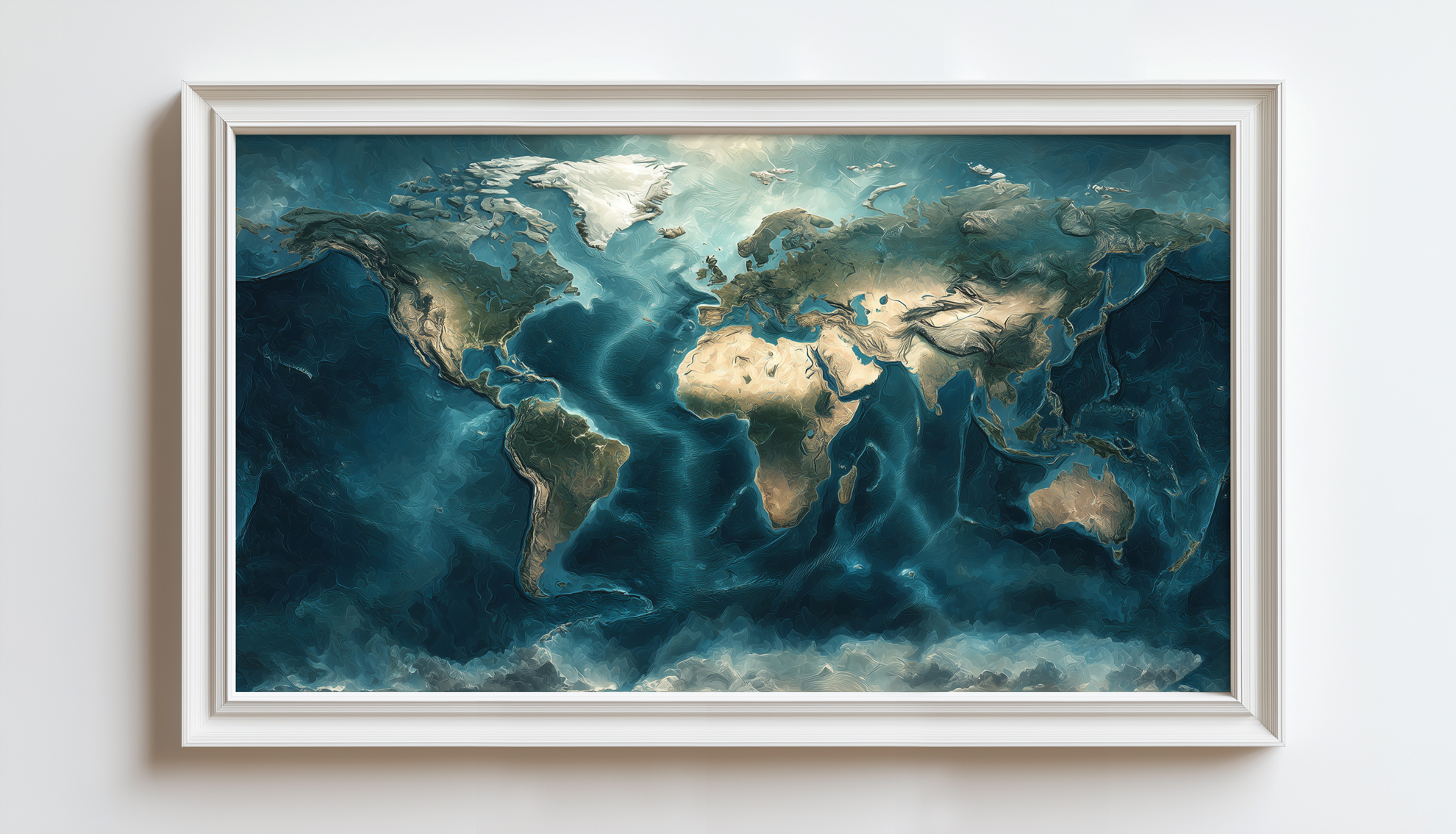 Carte du monde sans texte, idéale pour une décoration murale apaisante et contemporaine.