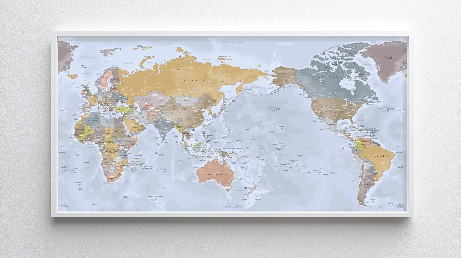 Mappemonde tableau Centrée sur le Pacifique rigide sur Plexiglas® pour un Tableau de qualité.