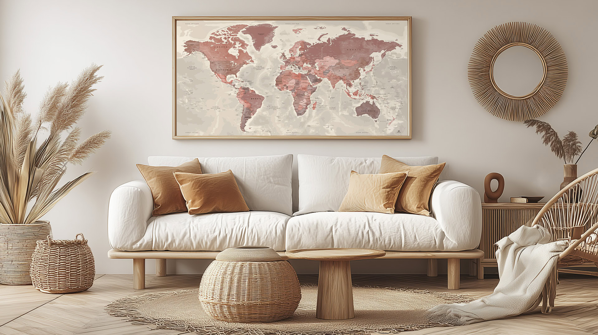 Apportez élégance et savoir à votre intérieur avec notre Grande Carte du Monde murale aux tons ocres, inspirée de l’architecture andalouse.