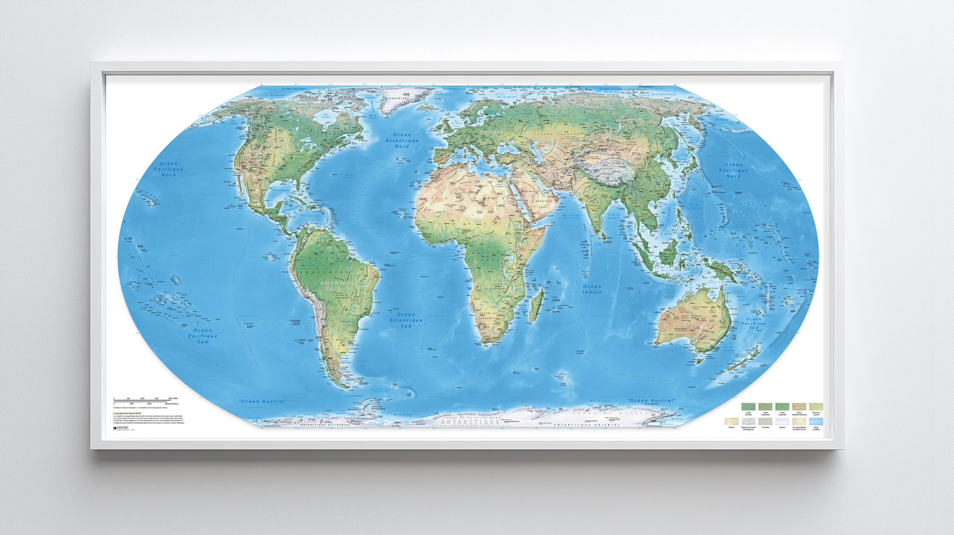 Mappemonde Equal Earth - Physique en Poster sur trois matières au choix (Adhésif, Bâche et Photo), beaucoup plus robuste qu'un papier poster classique. Des matières de très bonne qualité au rendu mat sans l'effet miroir indésirable d'un papier plastifié et également lavable.