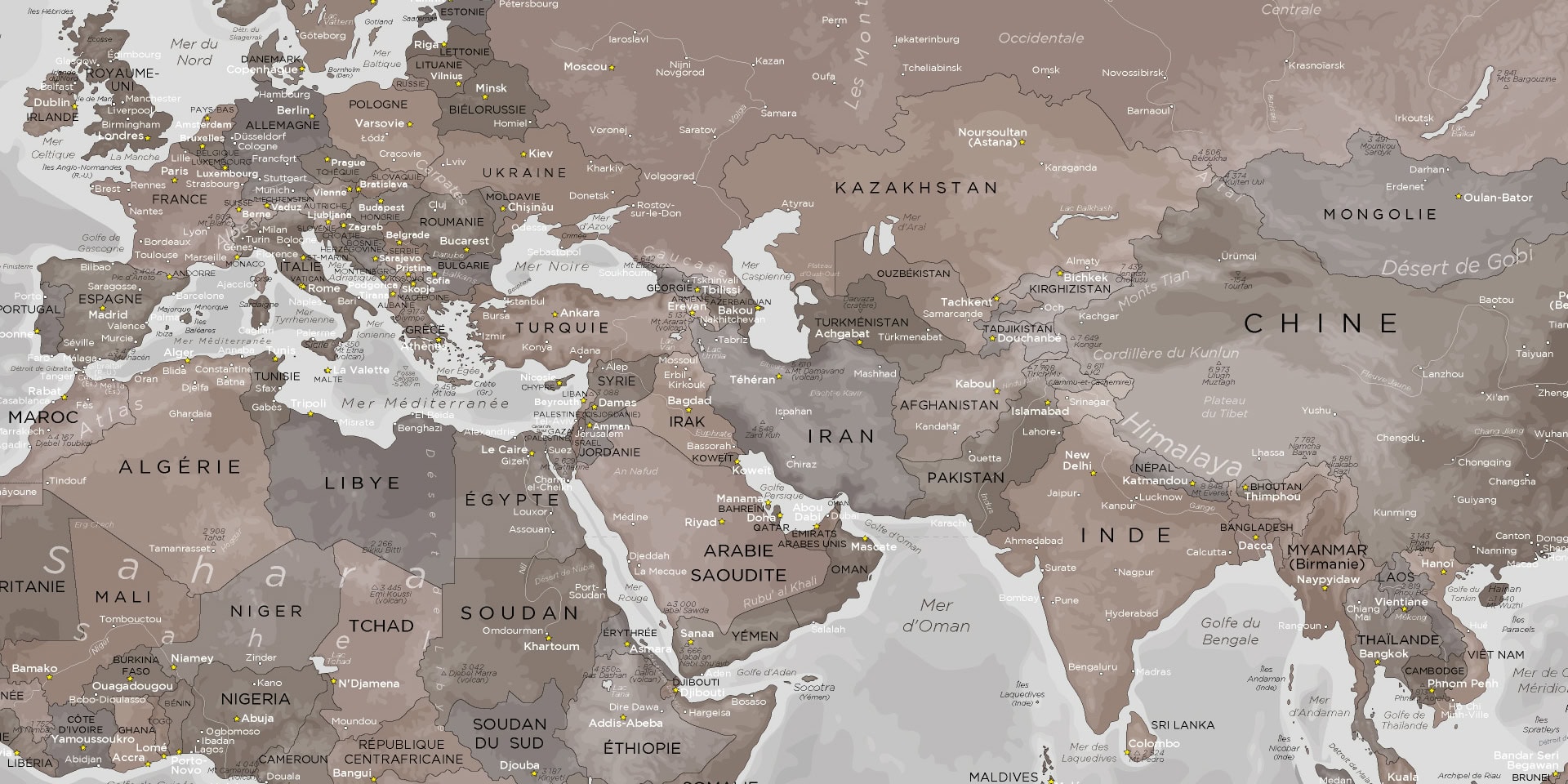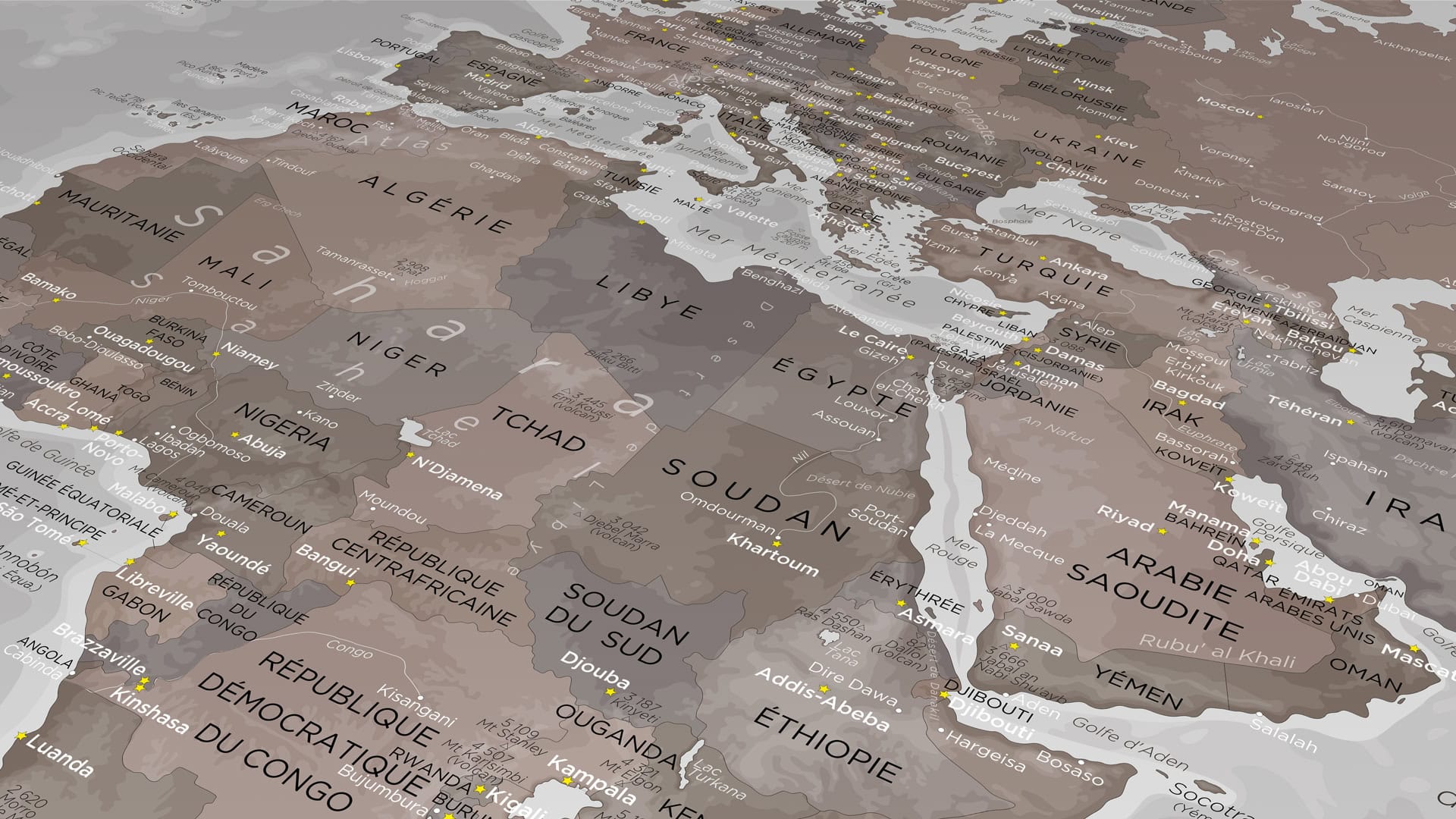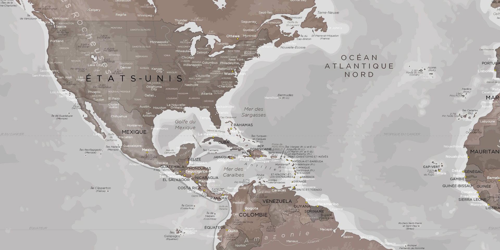 Pays – Capitales – Océans – Îles – Villes – Mers – Chaînes de montagnes – Monts – Lacs – Volcans – Fleuves – Fosses océaniques.