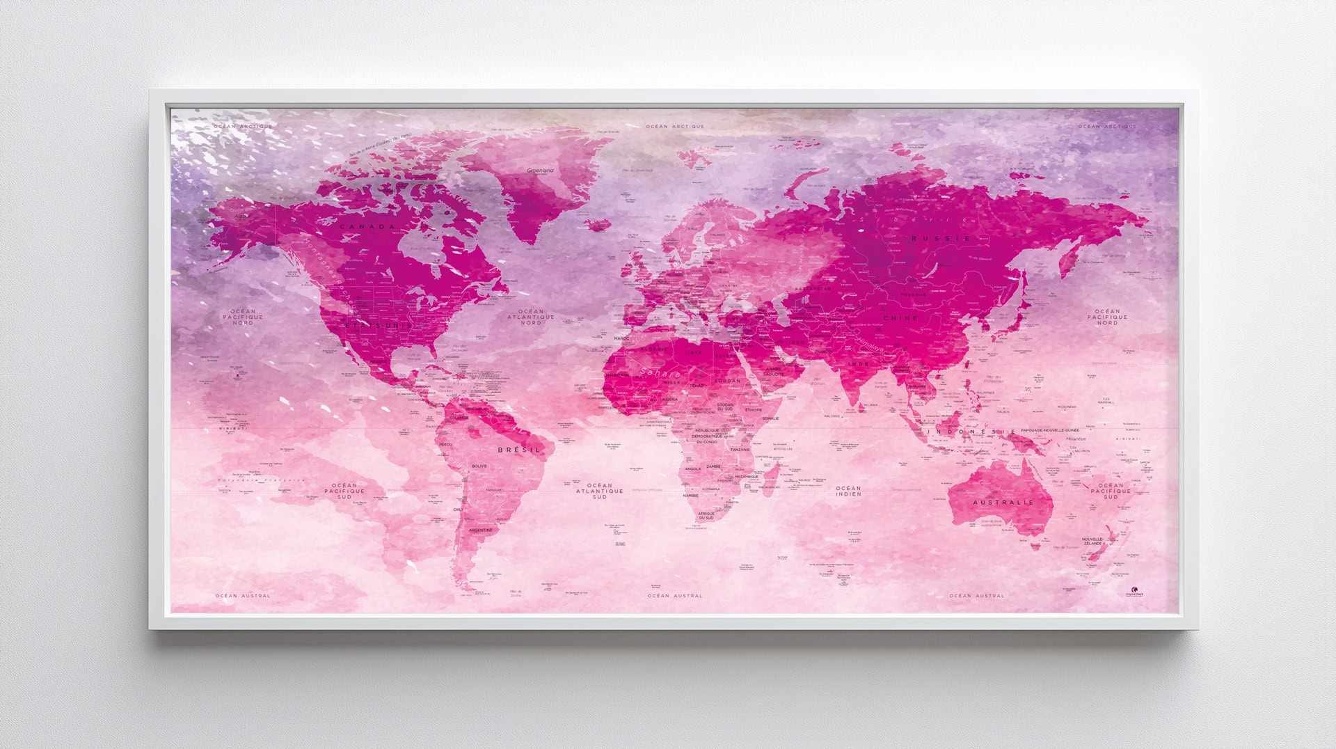Apportez une touche artistique et élégante à votre intérieur avec cette Mappemonde Tableau à effet aquarelle dans de délicats tons de rose. Idéale pour une décoration moderne et lumineuse, elle allie esthétisme et richesse d’informations.